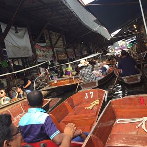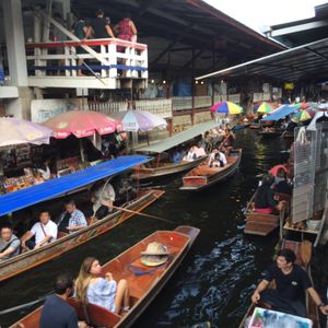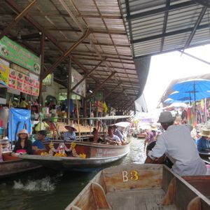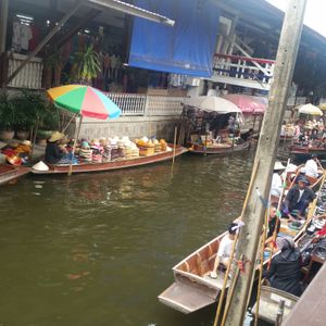 水上マーケットはまずエンジン付きのボートに乗車しますがガイドさんの指示に従いながらボート先端に乗船すれば大迫力です(先頭乗船不可能の場合があるらしい)次に有料の手漕ぎボートに乗船し買い物!(買い物は交渉で安くなる)有料なので希望者だけだが乗船しない人は居ませんよ!他にヤシの砂糖作り、タイラーメンで(辛めのスープがお勧めですノーマルは味が無し)終了です。道路が混雑していなければ14:00頃に帰れます(土日がお勧め)