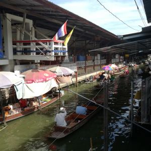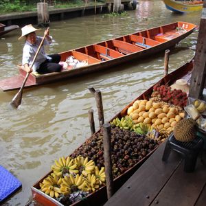 友人と2人で参加しました。ホテルのロビーに6:40に集合し、2つのホテルで他のツアー客をピックアップしてまずは水上マーケットへ向かいました。参加されていた方はおそらくみなさん学生の方で、全員で9名で出発しました。バンコクから水上マーケットまで南へ100キロ、途中ヤシの木農園の見学に立ち寄りました。水上マーケットまではエンジンボートに乗って約50分、川の両サイドには高床式の家が立ち並んでいたり、木が生い茂っていたり、ジャングルクルーズのような感じでした。また、ボートはすごいスピードで走る時があり、とても楽しかったです。水上マーケットに着いて、200B払い手漕ぎ船に乗って30分ほどマーケットを楽しみました。その後、再び1時間半ほどかけてバンコクへもどり、ホテルでブュッフェを食べました。そして、次は南へ約80キロ、アユタヤに移動しました。4つほど遺跡をみて、象に乗って、バンコクへ戻りました。予定より早く、18:30ごろホテルに到着しました。