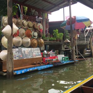 最初は、水上マーケットへ向かいますが、途中ココナッツファーム?に立ち寄り、トイレ・ショッピングタイムを取ります。おみやげ物は観光客価格になっています。そのあと水上マーケットへ向かいます。エンジン付きのボートに乗り換え20分くらいだったか川(水路?)を進みマーケットに到着です。ここで、手漕ぎボートに乗りたい人は別料金で乗れるようです。私たちは乗らなかったので料金は覚えていません。ここでお買い物する時は言い値では買わず必ず交渉してお安く買いましょう。この後は一旦バンコクに戻り 昼食をとります。バイキングでしたが、中華?っぽかったです。評価は・・・。お察しください。