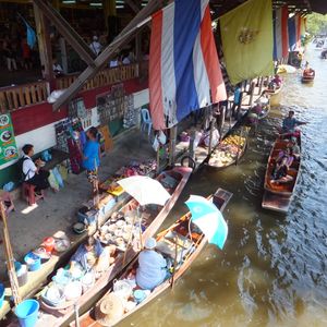 写真やビデオに様子を収めようと思い、線路市場で早めに場所取りをしても無駄でした。ルール無用の方々がお構いなしに人の前に前に割り込んできて、最後は電車スレスレのところまで人が前に来ます。諦めて、線路市場を散策して雰囲気を楽しむ方がいいです。水上マーケットでは必ず手漕ぎボートに乗るべきです。子供達はとても楽しんでいました。値段は値切っても値切っても仕上がりはぼったくりに近い額ですが、生活支援だと思えば安いものでした。手漕ぎボートはガイドさんが話をしてくれたので、クチコミ等に書かれている額の半額くらいでした。タイラーメンはあっさりしていて美味しかったです。