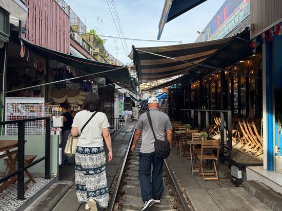 私が、当ツアーでいちばん印象に残ったのは、朝一番で行ったメークロン線路市場である。