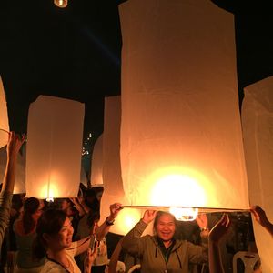 実際に自分たちがランタンを上げるときは、周囲にいるツアー参加者と協力し合って大きなランタンを上げました。