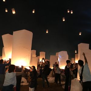 とにかくすごい人。最初は周りの人が近いうえに火が着いたランタンが飛んできたりしてちょっと怖かった。徐々に慣れ、周りの人達と3、4人で一緒に打ち上げいい思い出になりました。ただ人が多くてテーブルがなく打ち上げ前にあまり食事がとれなかったのが残念。