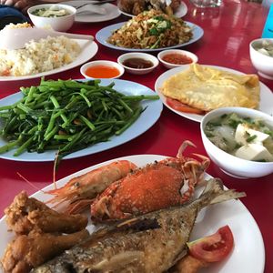 空芯菜の炒め物やチャーハンは食べ放題、ひとりにシーフードメインのBBQがつきます。