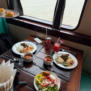 クルーズは、まずまずきれいな船で快適でした。2時間ほど乗りますが、比較的静かですし揺れもありません。食事もトマトパスタやラザニアから鶏肉のステーキやエビの塩焼き、トムヤンクンやパッタイといった料理があります。食べやすい味付けでした。フルーツやミニケーキも豊富です。水とコーヒー、紅茶は無料です。有料ですがソフトドリンクやビールを飲んでいる人も多かったです。クレジットカードが使えます。食堂のテーブル(指定席、結構快適)で過ごすのも良し、風があるものの暑いですが2階のデッキで過ごすのもいいです。田舎の風景からバンコクの都会の景色まで見られるので飽きません。川沿いに寺院もたくさんあります。バンコクに入ってからは、高層マンションや政府機関、王宮やワットアルンが船上から見られるので、こちらもおすすめです。