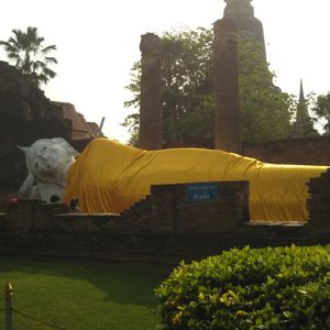 アユタヤへは1時間ドライブで、まずはワットロカヤスタ。ミャンマーとの戦争で焼けていてバンコクのカラフルな寺院とは対照的です。42メートルの釈迦像が悠然と横たわっていました。