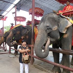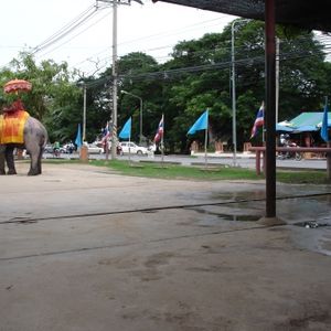 アユタヤの最後に、象乗りの出来る所に寄りました。希望者は有料で乗ることが出来ます。私は他で体験済みだったので、乗らなかったのですが、ツアー同行者に希望者がいると、終わるまで待っていないといけません。でも、ちょっとしたお土産屋があります。また、有料で象と一緒に写真を撮ることが出来ますが、わりと近くに象がいるので、ポーズを気にしないなら、勝手に写真を撮ることは可能です。有料でえさやりをすることも出来ます。
