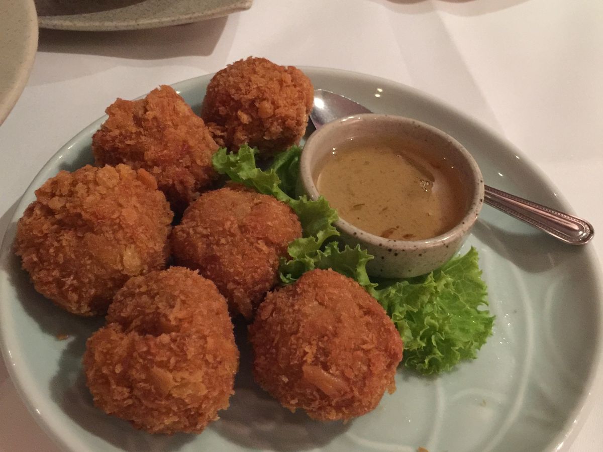 図らずも一番暑い時期にタイに行った為、日中は現地の人々も涼を求めて大型ショッピングセンターに群がるようです。夏休み中の学生やカップル、家族連れ、昼休み中の会社員やO.L.がお昼を食べにレストランフロアに大挙していました。そんなフロアの一角にあるソンブーンの新しい店舗。午前中の半日市内観光ツアーの都合で、予約時間より早く着いてしまったのですが、ちょっと待って、と言ってすぐに席を用意してくれました。席についてこちらのクーポンを渡すと、飲み物を注文した後に次から次へとコース料理が食べきれない程沢山出てきました。トムヤムクン、辛くない海鮮スープ、タロ芋のお団子、空芯菜の炒め物等々。全て美味しかったけれども、中でもやはり蟹カレーは名物だけあって一段と美味しく絶品で、遥々ここまで来た甲斐があった、と満足出来る味でした。蟹の身をきれいに殻から取り出すのに苦労をしていたところ、殻割りをサッと持ってきて下さったり、とサービスも満点。 店員さんのにこやかな応対も好感度抜群でした。全体的な満足感が高く、支払いの際のチップもつい弾んでしまう程でした。