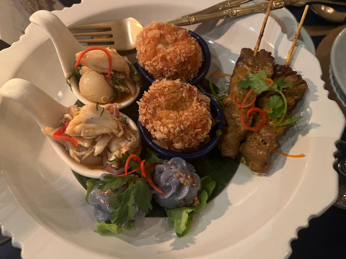 その後は次々とお料理が順番にコース仕立てで運ばれてきますが、その間もアナウンス(タイ語と英語)で車窓から見える景色の説明とお料理の説明があります。