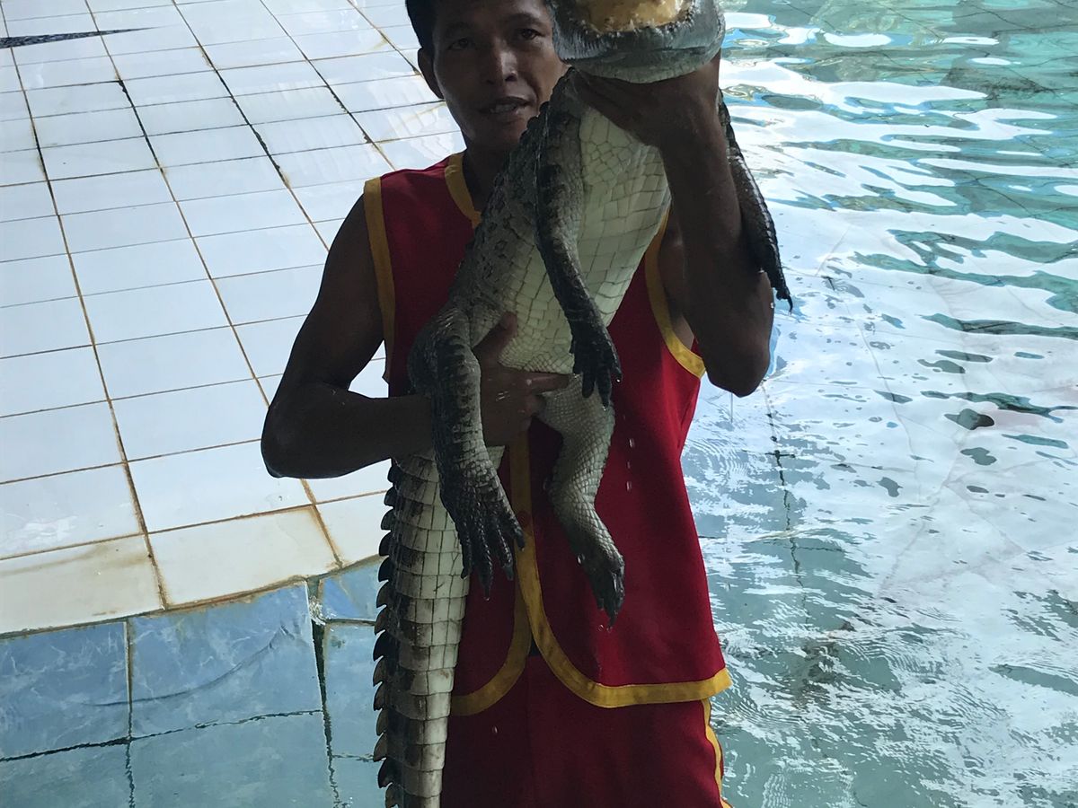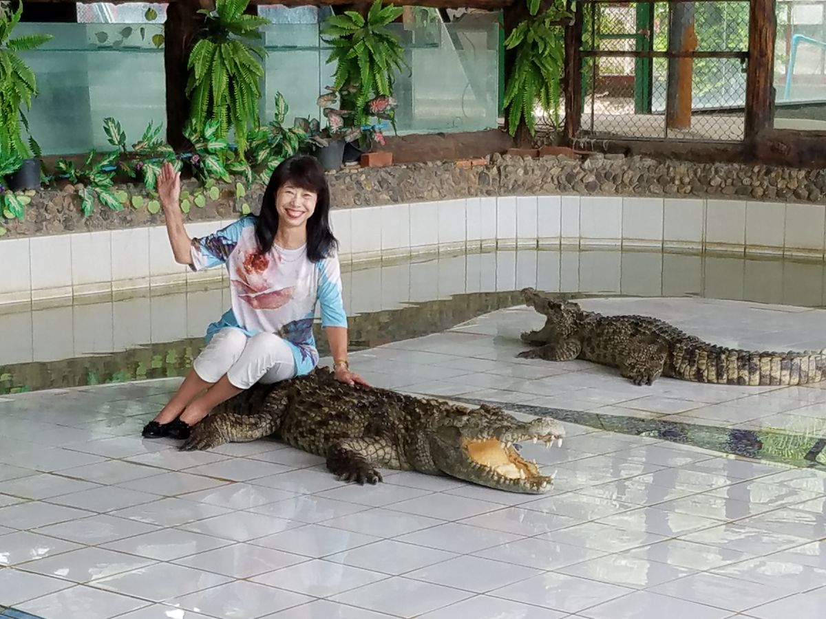 ●お次はワニ園。観客ワタシだけなのにワニショーやってくれました。ワニ使いは、ワニにキスしたり、ワニの口の中に頭を入れたり。ワニってのそ~ってしているのね。200バーツでワニに乗った写真撮影。