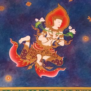 前回はピンクのガネーシャを見学する半日のツアーでした。今回は3台寺院とワットパクナムで、前回もワットパクナムが入っていましたが、時間が遅くめっちゃ混んでいました。今回は最初にワットパクナムから見学で一番に入場する事が出来ました、しかも一番なので見学者は私たちのツアーだけ。おかげさまでゆっくり、そして落ち着いて観る事が出来ました。よーく見ると天井に干支に乗っている神様が描かれておりました。 猪と犬の絵がやはり個性的で前者は豚に見え、後者は狐か狼見たいな感じです。 こういうのを観察するとまた違う楽しみ方が出来るのではないでしょうか。