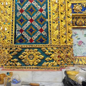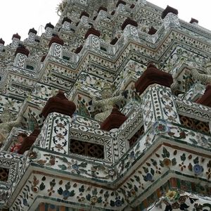 ワットアルンは渡り船で行きます。船着場の木はボロボロでスリリングです。建物には小さなお皿⁈のような陶器が埋め込まれていて可愛らしかったです。