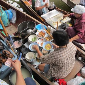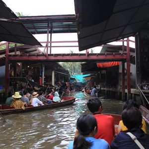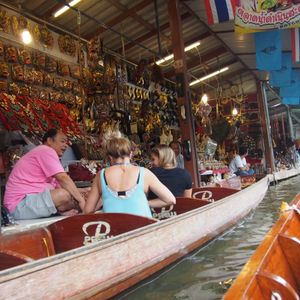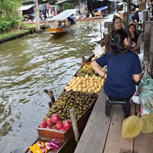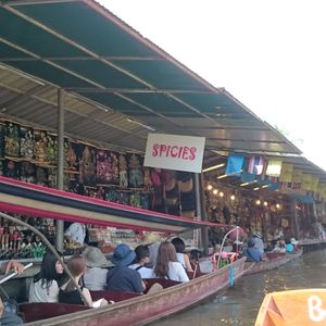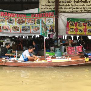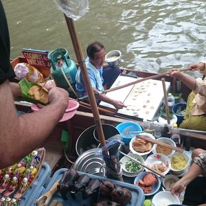 ダムヌンサドアク水上マーケットでは、お土産、食べ物などいろいろ売れており、とても楽しかったです。ガイドさんは慣れているので、とくに待ち時間なしでスピードボート・手漕ぎボートに乗れました。スピードボートに乗るときは帽子が飛ばされないように注意することが大切です。