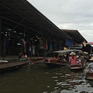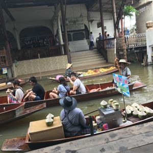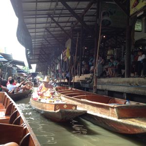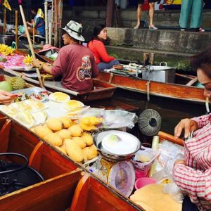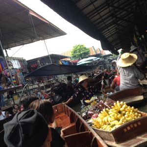 参加が土曜日だったからか、かなり水上の手漕ぎボートが混んでおり、お互いにぶつかり合いながら進んでました(^_^;)私たちはココナッツアイスと揚げバナナとフルーツを買いましたが、どれも美味しかったです。帽子や服や工芸品などのおみやげを売ってる船もたくさんありましたが、あんまり売れないせいか、やる気のない感じでお店の人が座ってることが多く、思ったほど活気溢れる感じではなかったです。特徴がある景色ではあるので時間があれば行ってみていいと思いますが、特に期待を超える何かがあるわけではないので時間がなければ無理に行かなくてもいいかなという印象でした。