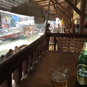 手漕ぎボートに乗り水上マーケットを巡るのですが、自分は以前乗ったので同僚だけ他のお客さんと巡る事に自分は暑いので、ビールを飲みながらひと休み。