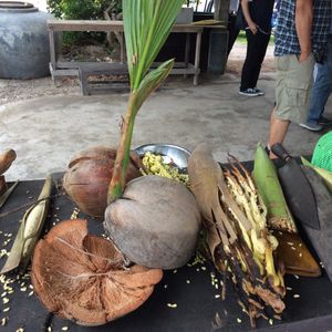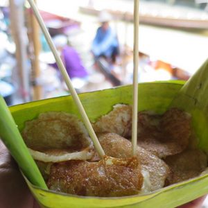 朝7時頃に集合し、バンに揺られること1時間弱、まずはココナッツファームに立ち寄ります。ここでは実際にココナッツの実や花を用いてココナッツオイルやミルクの作り方を説明していただきました。その後約30分で水上マーケット近くの駐車場に到着。マーケットにはスピードボートで向かいました。時々水しぶきがかかりましたので、汚れてもよい服装でお出かけされることをお勧めします。マーケットは新鮮なフルーツや郷土料理・雑貨などを売る現地の人と観光客でごった返しており、とても賑やかです。自由時間が1時間半程あり、地上の散策だけでは時間を持て余してしまうので、やはり200Bとそこそこのお値段はしますがw手漕ぎボートに乗って見学するべきだと思います。揚げバナナとココナッツパンケーキを食べたのですが、良心的なお値段の割にとても美味です。最後にガイドさんがマーケットが良く見える撮影スポットへ案内してくださり写真も撮っていただきました。とても良い思い出ができました。