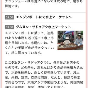 船場に着き、水上マーケットに向かう船での移動はとても風が気持ち良く、着いてからは日本では味わえないタイ独特の雰囲気を味わうことが出来ました。マーケットもたくさん出店しており、フルーツや雑貨、色々な食べ物があり現地の人と交渉して買い物をするのが楽しく、買った食べ物もその場で食べれて大満足でした。現地ガイドさんもとてもフレンドリーで終始楽しい雰囲気でした。またタイやマーケットについて教えて下さいとても居心地のいいツアーでした。少人数なのがまたよかったです!ツアーは自由に行動する時間が多くとられており、ゆっくりマーケットやその付近のお店を見ることが出来ました。お昼過ぎに