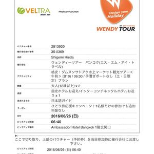 時間通りにお迎えに来てくれた。そしてバウチャーを持っていた私に向かい目が合ったら第一声が日本語で「おはようございます」だった。私はタイ人送迎係のこの一言ですごい安心感を得た。しっかりした会社だと思った。ツアーの集合場所のツインタワーホテルに到着し少し待ち時間があったがその間にトイレを済ませやや小さめの観光バスに乗り出発。中には一人で参加している参加者もいたがガイドはしっかり目配り気配りができていた。途中ココナッツファームにてトイレ休憩、バスを飛ばしやっと水上マーケットへ行く為のエンジンボート乗り場に着くとそこからはスリル満点の大爆走。水は汚いが実に楽しかった。水上マーケットに着くと手漕ぎボートに乗換えいろんな店を見て回ってくれたが、何せ異常に混んでおり水上の交差点に信号機がほしいほどだった。売物の値段は確かに滅茶苦茶高かった。事前にガイドから欲しかったら値段交渉をと説明あり。参考までに小銭入れは市内の露店の5倍の値段から交渉スタート。結果良くて半値なので買わなかったが(笑)。すれ違うボートフルーツ売りのおばさんからマンゴを買って食べたがとてもおいしかった。揺れるボートに乗って買い物する事は日本ではできない。そしてバンコクから観光客がここへは行くにもエンジンボートや手漕ぎボートに乗るにもタイ語もかなり必要だし、個人では難易度が相当高いのでこの様な現地ツアーをお勧めします。私は内容も濃く実に楽しくいいガイドにも当たり大成功だったのでベルトラとウェンディに大感謝です。いい思い出をありがとうございました。