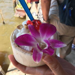 早朝5時に空港に着く深夜便だったので、空港発プランにしました。7時の待ち合わせには1時間ほど余裕がありました。ココナッツファームは、ほとんどトイレ休憩で終わってしまいましたが十分だったと思います。水上マーケットに着いてからは、まずエンジンボートに乗り、結構なスピードで水路を進んでいきました。これは乗っていて楽しかったです。次に現地の人が漕いでくれる手漕ぎボートに乗りました。水路の両側がお土産屋さんで、もし買いたいものがあればボートを寄せて値段交渉しながら買うスタイルです。観光客の船で大混雑していました。残念ながら、時間帯のせいなのか、日用雑貨や生鮮食料品を積んだ現地の人たちは見かけませんでした。ツインタワーホテル内のビュッフェはとても美味しかったです。料金的には少し高めですが、スーツケースと一緒にホテルまで送ってもらえるので、深夜便で着いた私たちにはよかったです。(その日は私と娘の貸し切りでした。)