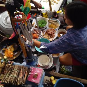 エンジン付きのボートでしばらく運河を走りますが、あまりきれいには見えない水しぶきが飛んでくることがしばしばあります。マーケット自体は独特の雰囲気があって、なかなか楽しめます。お土産物、果物、飲み物、ラーメンなどが手漕ぎ舟で売られており、興味深かったです。ただ、混みすぎているのか、観光客ばかりで手漕ぎ舟のお店が少く見えたのか、あまりいい写真が撮れなかったです。