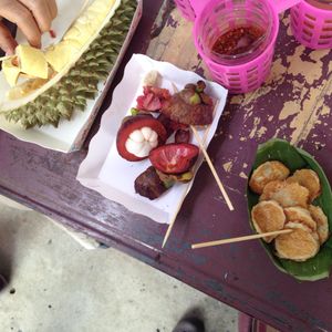 自由時間にフルーツや麺をたべました。ドリアン、マンゴスチン、