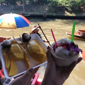 水上マーケットでのアイスクリームはお勧めです。また、エンジンボートで、運河を走り抜けるのは爽快でした。