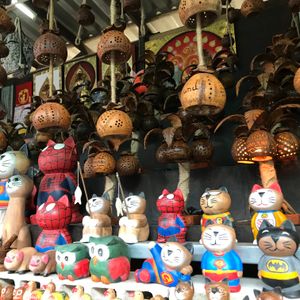 その後、手漕ぎボートに乗り換えてマーケットを回りましたが、こちらはもっとバランスが不安定で揺れました。商品はほとんど土産物で、果物や飲み物は船着き場でしかほとんど買えませんでした。いろいろ見ているとお店の人はめぼしい客に狙いをつけ、カギ棒でボートを引っ張り寄せて、少々強引に値段を言って買わせようとしてきます。ノーと言い続ける根気が必要です。