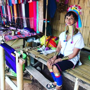 思ったよりも揺れるのでびっくりしましたが象さんたち可愛かったです。ここのパークの自由行動で、首長族に会ってきました。とてもカラフルな織物を織っていて綺麗な皆さんでした。