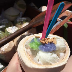ボートに乗りグルーっと一周。値段交渉して手に入れたココナッツアイスクリームは格別。ガイドさんの配慮で、混む前の時間帯に連れて行ってくれてラッキーでした。最後の方は混み始め、船たちが渋滞していました。