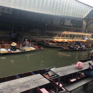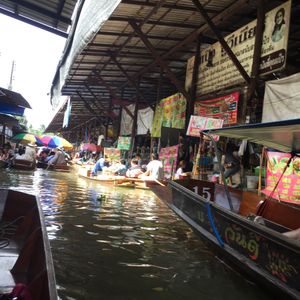 ダムヌンサドアク水上マーケットでは舟に乗りながらココナッツアイスを買って食べましたちょーうまうまです。タイラーメンを逃してしまいガックリ!途中大混雑で他の舟とよく接触、体にも当たっていました。水路の両脇はお土産物でぎっしり見ごたえありとても楽しい時間でした。