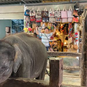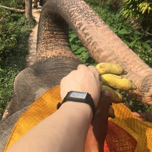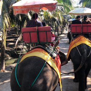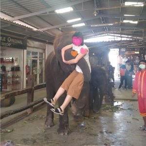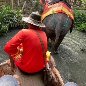 象乗り体験所に到着すると、象乗り場へ案内される。他にも追加料金はかかるが、オラウータンとの撮影や触れ合い、シューティングなど体験コーナーがあった。象に乗ると20分ほど、ジャングルの歩道に沿って探検。二箇所ほどスタッフによる撮影ポイントがあり、後々像の糞をリサイクルして作られた写真縦に入れて写真を販売してくれる。たしか300バーツほど。途中、他の客の象使いとカメラを交換して無料で写真撮影もできた。終了後、象を撫でられず個人的に納得が行かずに降り場から出たところで象のエサ用のバナナを売っているコーナーがあった。そこでは餌やり体験とともに触れ合ったり、写真撮影をさせてくれた。象にキスをしてもらったり、象乗りと同じくらいいい体験ができ、非常に満足だった。