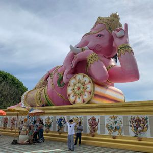有名なピンクのゾウさんの像があるところです。到着して、まず昼食と休憩をとりました。食事を提供する店舗が並んでいるエリアがあってお値段も観光地価格ではないのが良いのですが、メニュー名などはタイ語でしか書かれていないので、ガイドさんがみんなの注文を手助けしていたりして助かりました。休憩時間中に見物をしておいた方がいいです。ピンクのゾウさんは巨大で見応えがあります。足元にいるネズミの像にお願いすると3倍の速度で願いが叶うそうです。自分の誕生日の曜日によって願うネズミの像の色が違います。
