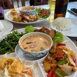 ランチはタイ料理、追加で蟹カレーを3名でシェアしました。このカレーが大正解◎別料金にはなりますがぜひ追加してほしいです。そしてスイカジュースもテイクアウト♪