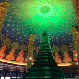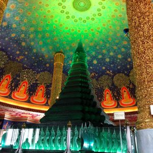昼から集合。午前中のツアーに参加していたのですが、すでに渋滞が影響して近くのハンバーガーショップで慌てて食事してギリギリに集合。まずは緑の仏塔へ。ここは新しいお寺だそうで、特に歴史等の説明はなく、緑のガラスの仏塔前でSNS映の写真を撮るのみです。次にピンクガネーシャへ。83キロ先で1時間43分かかりました。18:00ごろで日没ギリギリです。ここでもピンクガネーシャをバックに撮影。急ぎバンコクに戻ります。20:40鉄道夜市着。隣接するショッピングセンターパーキングビルから見下ろす写真を撮って夜市を彷徨い屋台で食事。1人50バーツくらいでおいしいタイ料理食べました。最高評価としましたが、移動時間は結構長く遅くなります。自分のニーズとよく合っているか確認することをお勧めします。なお鉄道夜市で解散しますがここからの帰りは激しい渋滞で地下鉄に乗りましたが、券売機が2つしかなく長蛇の列でした。疲れて同行者とケンカにならないようにしましょう。