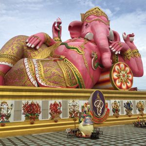 青い空にピンクのガネーシャがとてもファンタスティックな感じで、念願のネズミに願い事も伝えたし、ワットパクナムは素晴らしい景観でした、ガイドさんもとても楽しい方でした。