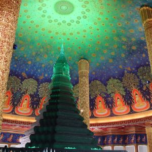 ワット・パクナム:大通りでバスを降りて添乗員さんの引率で小道をずんずん進んでたどり着きます。ガラスの仏塔と天井が本当に美しかったです。