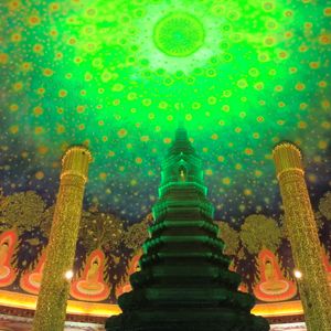次は待ちに待ったワットパクナム。建物の外観に感動はなくエレベーターで4階に案内されました。エレベーターを出ると思わす感動で「ワァー」って声が出てしましました。エメラルドグリーンに輝く仏塔と天井に描かれた壁画に目が奪われしばらくその場を動くことができませんでした。ガイドさんに2人で記念写真を撮っていただきました。後はゆっくり何枚も何枚も写真を撮りました。