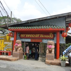 週末限定のツアーということで・・・これに参加したく旅行日程を変更しました。午後1時30分集合ということで地図の場所に行きツアーデスクに聞きましたが、いまいち誘導がわからず少しご立腹しながら出発を待っていました。まず、ワット・パクナム寺院へ向かいました。寺院の中に入りエレベーターで5階へ・・・降りるとそこで目に付いたのが天井でした。早速参詣し、写真を撮りました。ゆっくり見ていましたが、我々には、この5階がメインのように感じました。その後、ワット・サマーンラッタナーラーム (ガネーシャ)まで移動。約2時間ほど車に揺られ到着。ここでもしっかり参詣し日本語ガイドの説明に聞き耳をたてましたがよく聞き取れず残念。時間も時間なのでなにか軽食をと思いウロウロ、しかし時間が遅くすでに業務終了していました残念。ここからまた移動で2時間ほど車両に揺られて到着したのが、ナイトマーケット市場の隣接駐車場でした。上階に上って下を見ると、あら綺麗。いい感じの市場を上から見学し、写真を撮って、いざ市場へ・・・