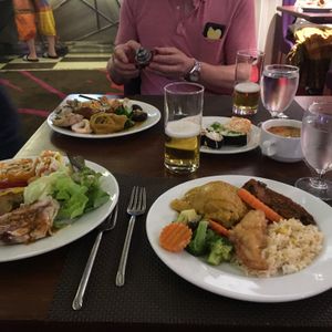 料理はお寿司やパスタ、サラダ、お肉など様々ありました。トムヤムクンも美味しかったです!!ドリンクは別料金です。