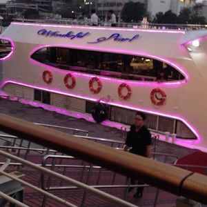 クルージングディナーにひとりで参加するのはちょっと不安でしたが、参加してとってもよかったです!夜は女性1人で移動は不安なのでツアーでなければ来れなかったと思います。船内でもライブをしていましたが、ファミリーやカップルばかりだったのでずっと3階で夜風にあたって風景を眺めたり写真をとったりしていました。ガイドさんが本当にとってもいい方で1人で参加のわたしに船内でも写真撮りましょうかと何度か様子を確認しに来て下さりました。笑顔がとても印象的で他にもおすすめのご飯屋さんやショッピングスポットなどケータイでわざわざ地図をだして説明してくれました。とって