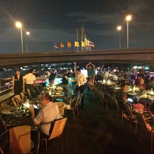チャオプラーヤー川ディナークルーズに9名で参加しました。船は古い方の船でしたが、食事も雰囲気も最高でした!特に昼に見る寺院と夜の寺院は印象が全然違います。
