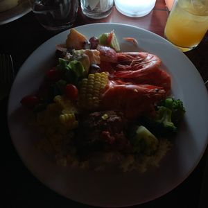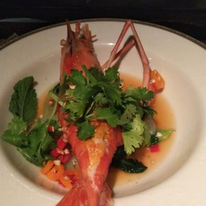 メイン→ココナツミルクを使った牛カレー、キノコのオイスター炒め、オニテナガエビの焼き物、魚を揚げたあんかけ