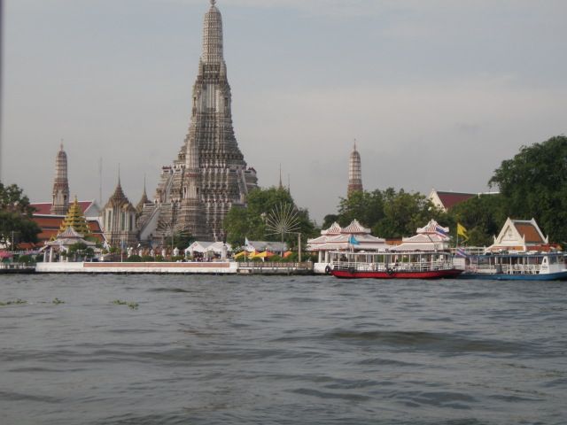フェリーでワット・アルンに向かうときはワクワクしました。前日が雨で、この日は曇りでした。朝日があたっていれば、まさしく暁の寺だったのでしょうが。