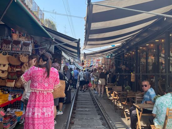 先日、バンコクの「水上マーケットと鉄道市場ツアー」に参加しました。朝早く集合し、バスで最初の目的地であるメークローン市場へ向かいました。この市場は線路上に広がっており、電車が通るたびに商人たちが素早く商品を避ける光景が見られます。間近で見ると迫力があり、観光客も一斉にカメラを構えるなど、非常に活気のある場所でした。
