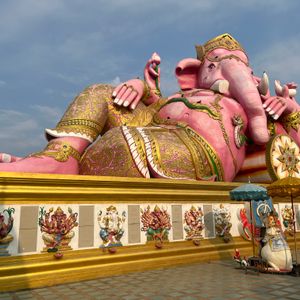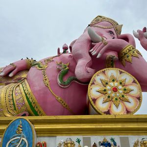 ピンクのガネーシャのお寺は、日本でいうと秘宝館やまぼろし博覧会のようなカオスな雰囲気で、荘厳なお寺という感じを想像しているとびっくりします。ガネーシャ以外にもわけのわからない、時に日本のアニメのフィギュアが乱立している場所です。往復にかなり時間をかけて行く場所なので、イロモノとして楽しめる方におすすめです。また人の少ない朝イチに行くので、ゆっくり楽しめ、ガイドさんにはタイのお詣り方法を教えてもらい、ガネーシャに金箔を貼る体験などもできました。ですが、朝イチなので周りの露天などはほとんどしまっています。