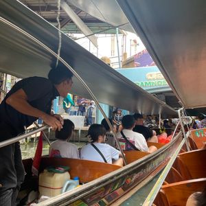 水上マーケットまでは、高速道路で1時間半から2時間くらいで到着しました。ボートに乗る前に写真を撮ってもらってから乗りました。その写真は降りたあと、写真たてになって100バーツで買うことができたので良い記念になりました。ボートは思ったよりスピードがあり、暑い中でも風があり気持ちが良かったです。いくつかのお店で止まって商品を勧められました。緑の中やローカルの雰囲気を感じながらジャングルクルーズのようで楽しかったです!鉄道の方は観光客がいっぱいでうまく写真を撮れませんでしたが、バンコクでは感じられない市場の雰囲気を感じることができ、子連れで行ったので良い異文化体験になりました。地震の後で不安もありましたが、ツアーガイドの方や、運転手さんも優しく明るい方で安心しました。
