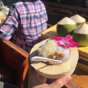水上マーケットではココナッツアイスがおすすめです。カフェはお値段が高めですが逆見本詐欺でメニューより豪華なのが出てきます。