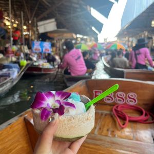 水上マーケットでは、ココナッツアイスが美味しかったです。柔らかいココナッツの実が削られたものが入っていました。船の上から物を買えますが、値段交渉すると安くなります。タイパンツなど、交渉次第では、街中で買うより安く買えるし、商品も悪くないです。というか同じものがどこででもかえますが、ここで買うのも思い出になります。