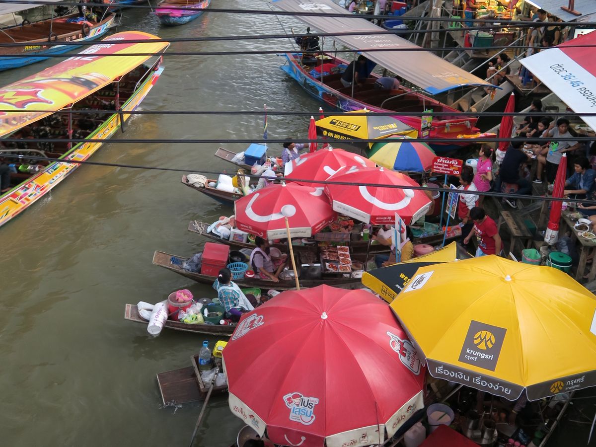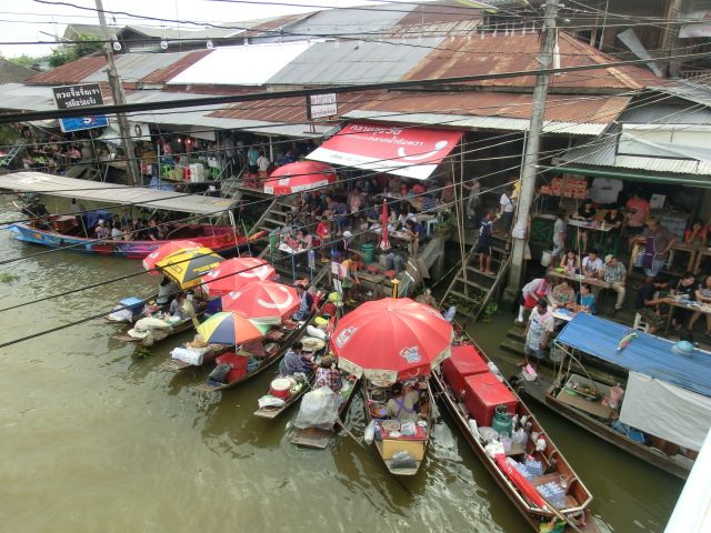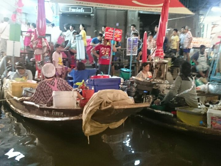 以前に水上マーケットへ行った人に「臭い」という話を聞いていたのですが、タイに住んでいる知人が「楽しいよ」と言ってくれたので、オプショナルツアーを申し込みました。エンジンボートで水路を廻るのも十分時間をとられており楽しめます。手漕ぎボートでマーケットを見て回るのも風情があって良いです。ただし、陸上より高いので注意が必要です。船着き場から上がると露店で果物や麺類を売っています。日本のあっさりラーメンの様な麺は美味しかった。冷えたビールが美味しかったけど、最初は150バーツ、次に120バーツ、100バーツまで下がったので飲みました。バンコク中央のコンビニで80バーツだったのでまあまあでしょうか。バンコクでは午後5時までお酒を売ってくれませんが、観光地は特別なようです。価値あるツアーだと思います。
