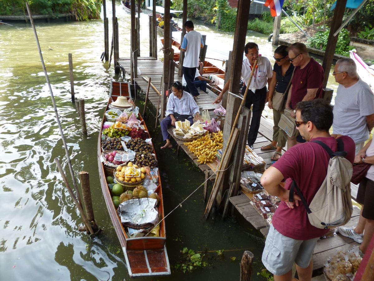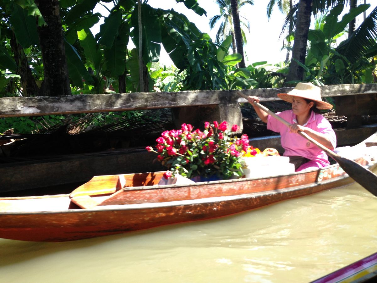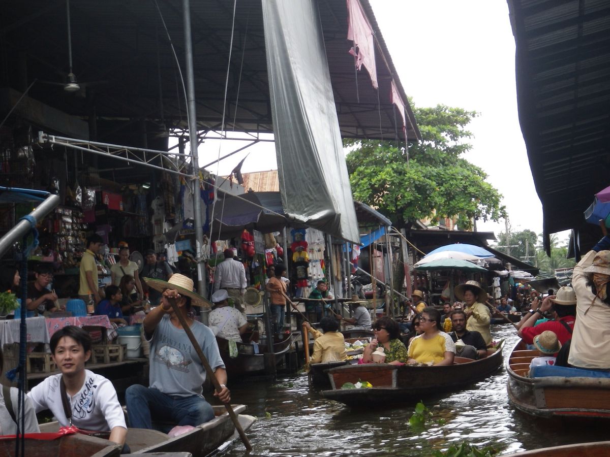 マーケットに着いたら必ず手漕ぎ舟に乗った方がいいですよ。200バーツで30分ぐらいゆっくり市場を回ってくれます。欲しい物があれば止まってくれます。商品は言い値の半額以下にはなります。3割ぐらいにもなる物があるので頑張って交渉してみて下さい。